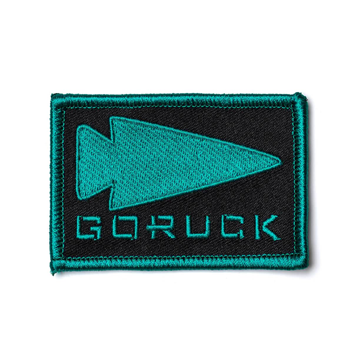 The GORUCK Spearhead Patch features a teal background with a prominent black arrowhead shape pointing to the right. Below this design, the GORUCK logo appears in bold black capital letters. The patch is bordered with a durable black edge and includes a convenient VELCRO backing for easy attachment.