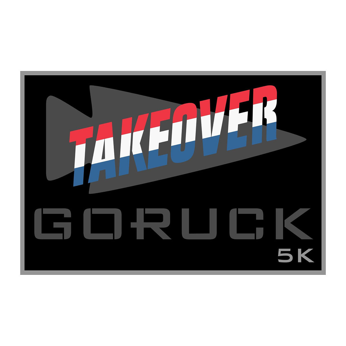 Patch - GORUCK TAKEOVER 5K features a red, white, and blue "TAKEOVER" logo on black—a must-have for social fitness fans and GORUCK TAKEOVER event enthusiasts.