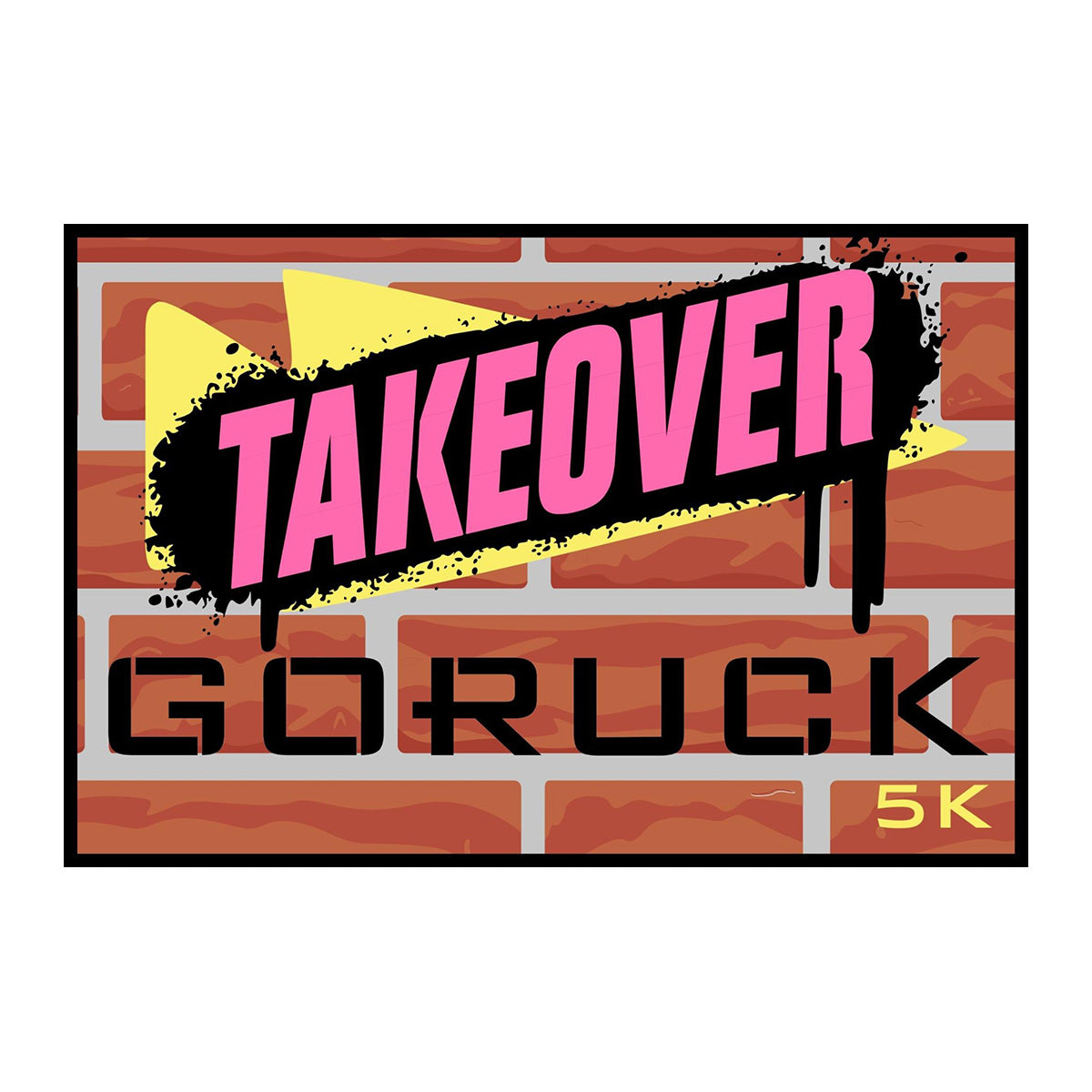 A graphic featuring the Patch - GORUCK TAKEOVER 5K with “TAKEOVER” in pink above “GORUCK 5K” on a brick wall, capturing the social fitness spirit of the GORUCK TAKEOVER event.