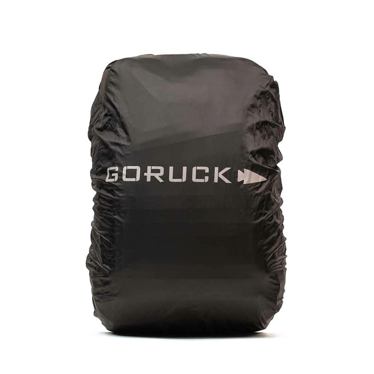 The GORUCK Ruck Rain Cover is a black, lightweight protective cover adorned with the word 'GORUCK' and an arrow logo in white. It serves as a durable waterproof rain cover, providing excellent protection for your backpack against the elements.
