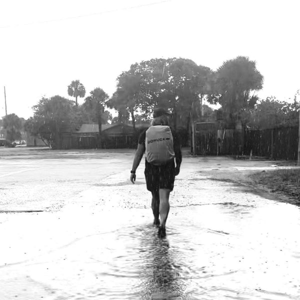 A person wearing a black hoodie and backpack with the GORUCK Ruck Rain Cover strides across a wet sidewalk dotted with puddles. They are moving away from the camera. To the right, there's a small cart adorned with flowers. Palm trees border the street on this cloudy day.