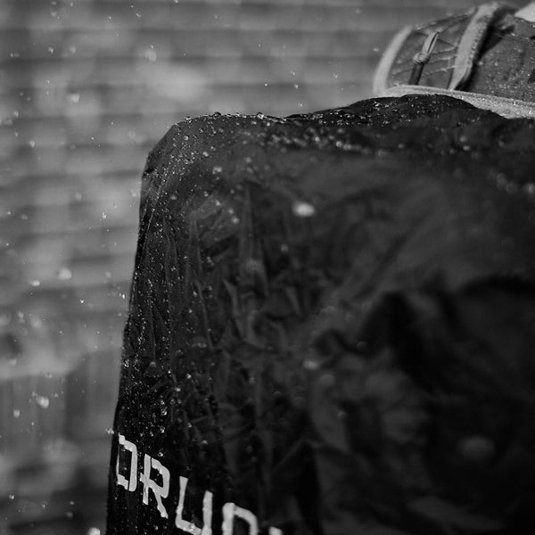 A close-up of the Ruck Rain Cover by GORUCK, a black waterproof cover, glistens with droplets. Text from the partially visible logo stands out against the blurred backdrop of a brick wall, as raindrops cascade down, showcasing its lightweight design.