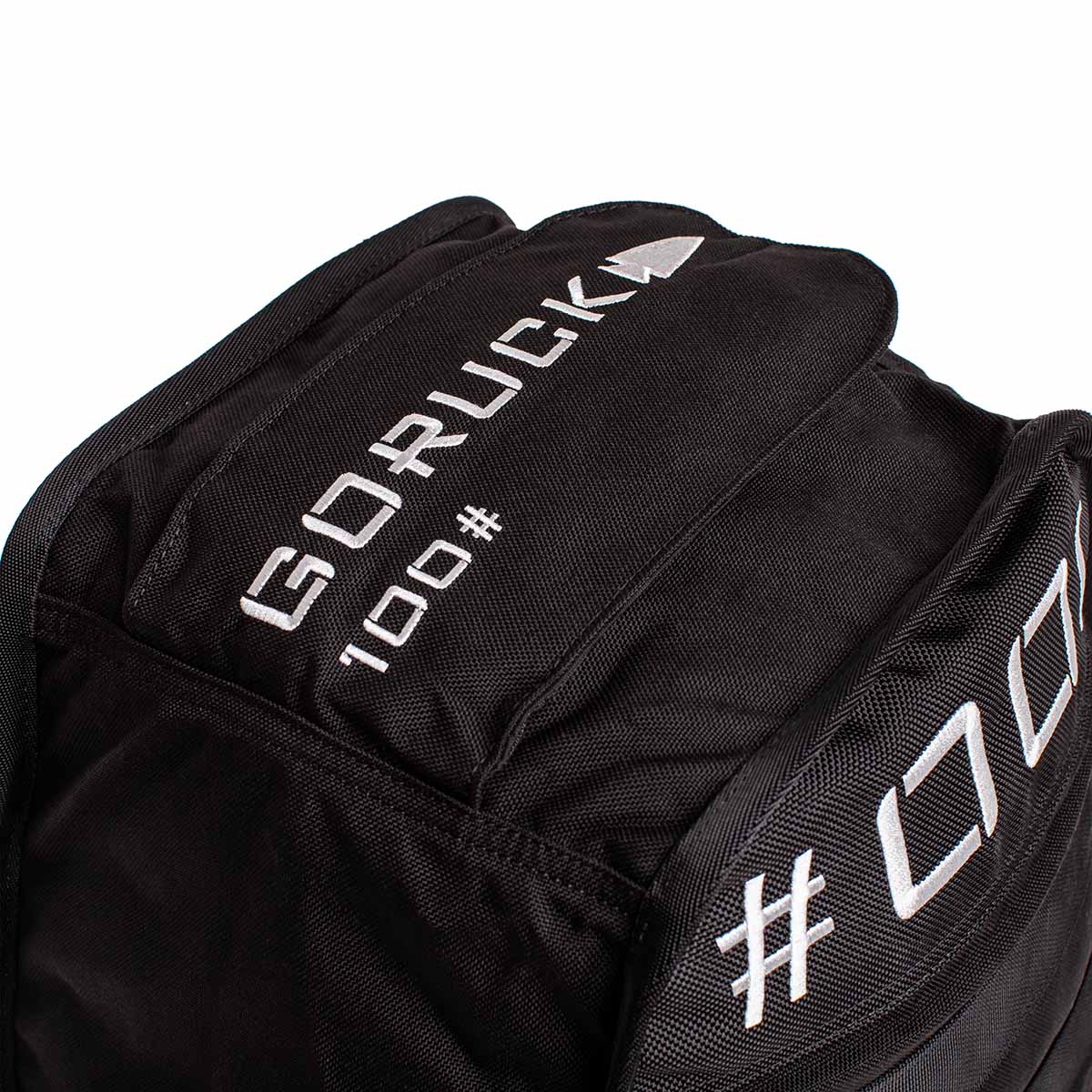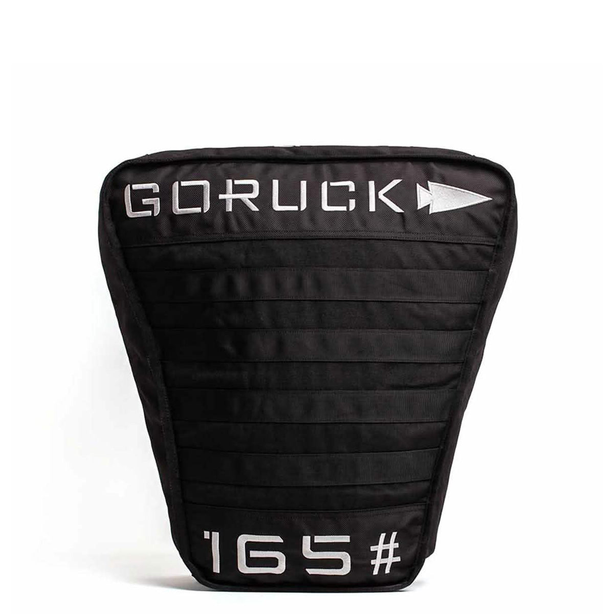 A close-up of a black Sand Tombstones by GORUCK showcases white embroidered text, including GORUCK, 165, and partial text 165 on the fabric. Its rugged design features a multilayer closure system, making it perfect for loaded carries and inspired by the durability of the Husafell Sandbag.