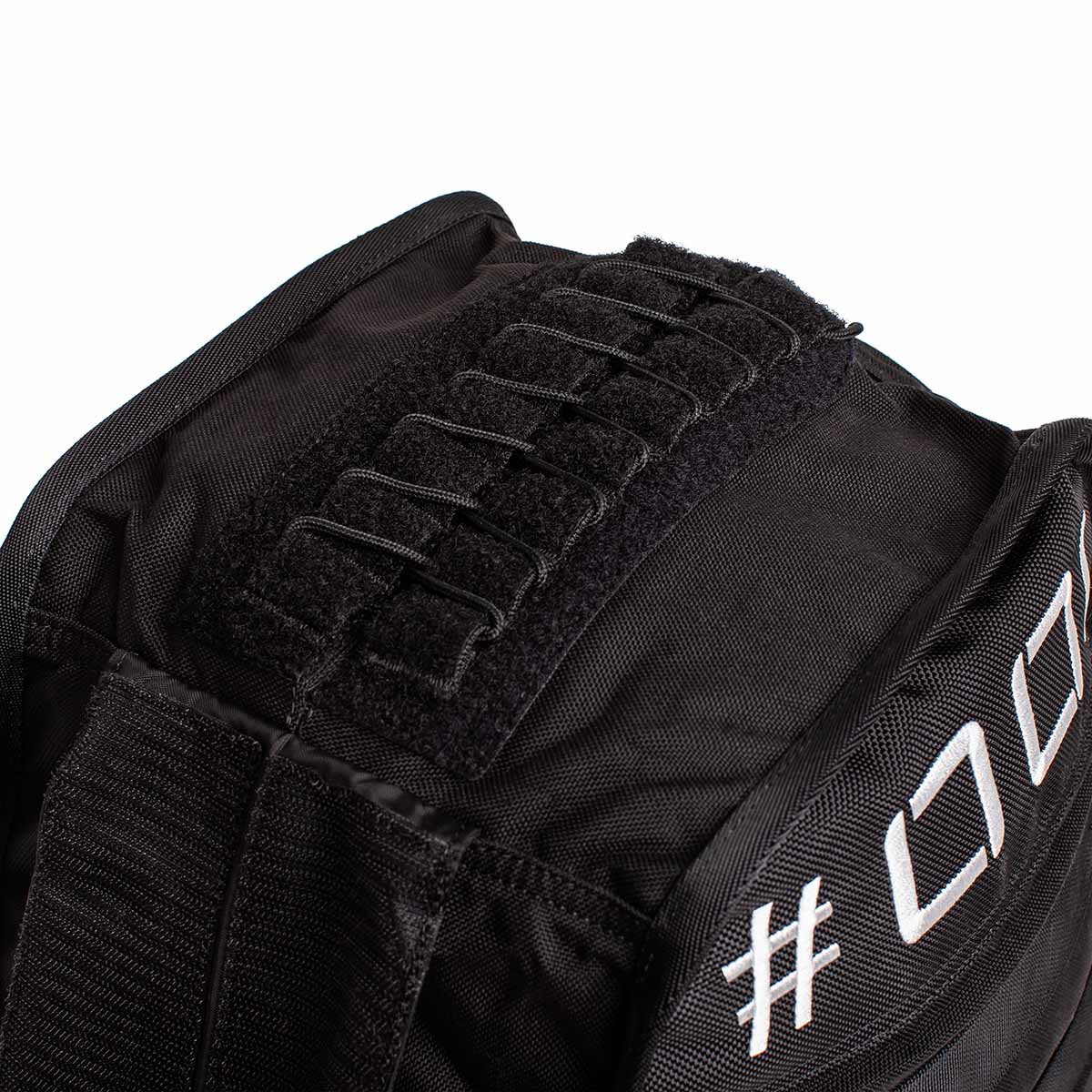 Close-up of a Sand Tombstones backpack by GORUCK, showcasing a robust multilayer closure system with open loops on the upper section and part of a white, segmented pattern on the side. The durable and textured material makes it perfect for husafell sandbag training or loaded carries.