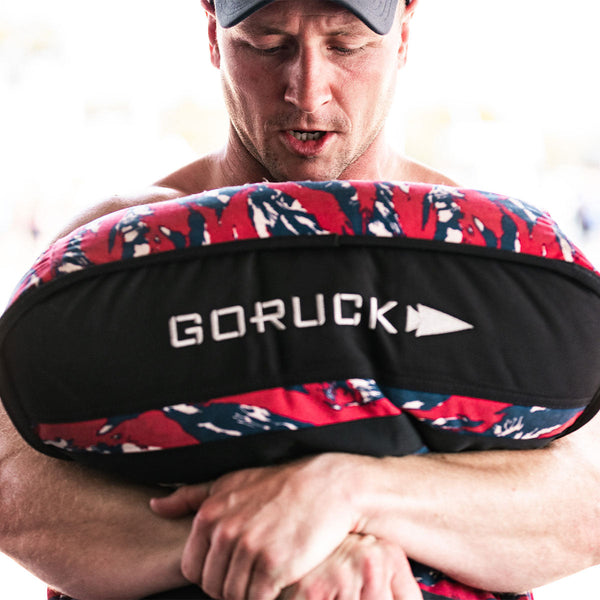 A man is standing outdoors, gripping a large protective pad labeled GORUCK in black and white. With a focus akin to tackling Sand Tombstones, he stands ready, as if for loaded carries. Behind him are a tent and a large bin, adding to the scene's rugged aura.