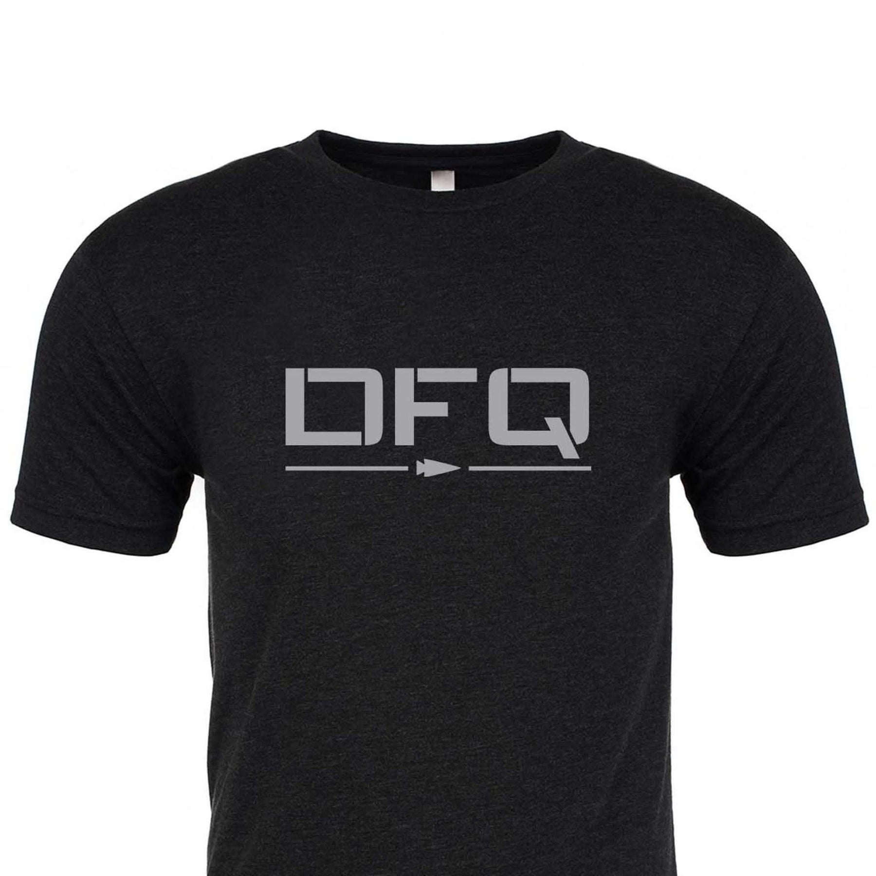 The DFQ Tee Tri-Blend by vendor-unknown is a black T-shirt showcasing "DFQ" prominently printed in gray on the front, subtly reflecting the mantra "Don't F*king Quit," and adorned with a small, motivational arrow design positioned just below the text.