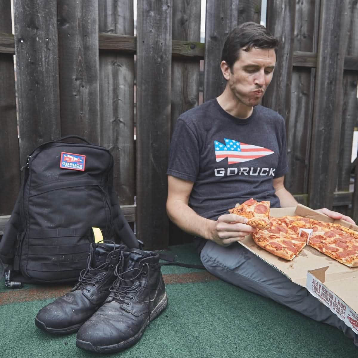A man sits on the ground next to a wooden fence, savoring a slice of pepperoni pizza from a box. A black backpack and worn-out boots are beside him. He's wearing a dark GORUCK USA Tee - Tri-Blend by vendor-unknown and appears to be thoroughly enjoying his meal.