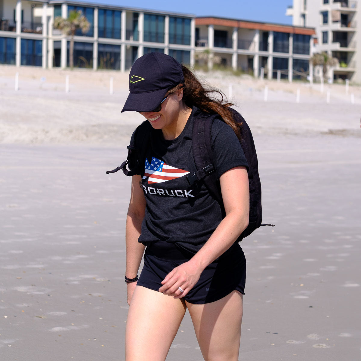 A smiling woman in the GORUCK USA Tee - Tri-Blend and a GORUCK spearhead backpack walks along a sandy beach, with buildings visible in the background.