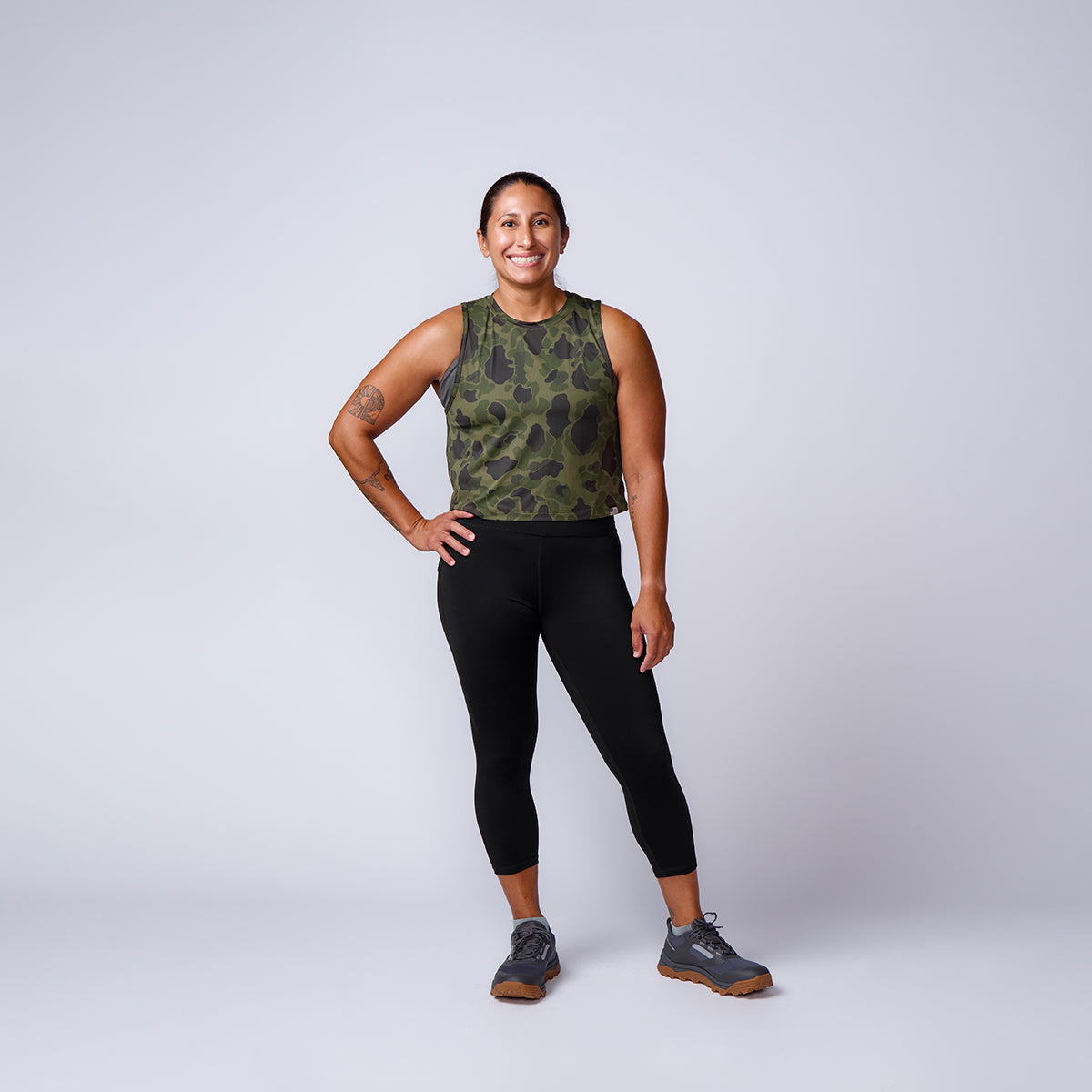Person stands with hands on hips, wearing ToughFlex Women’s Training Leggings Pocket, a camo tank top, and gray sneakers, facing away.