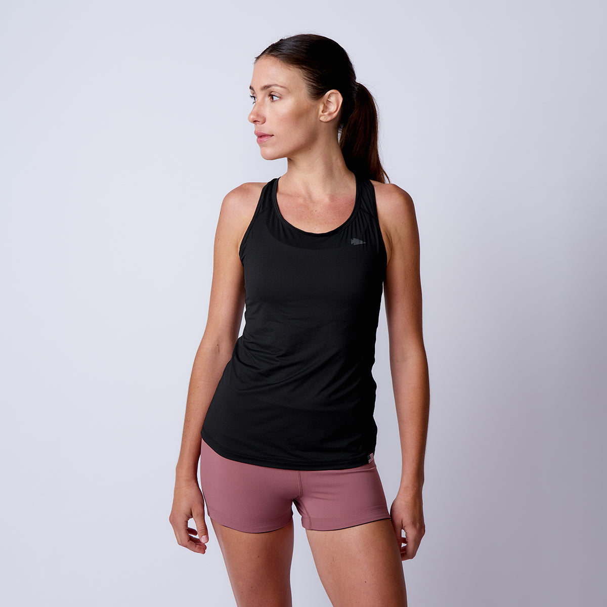 A woman faces away, wearing the Women’s Racerback Tank - ToughMesh in black Italian performance fabric and mauve shorts, standing against a plain background.