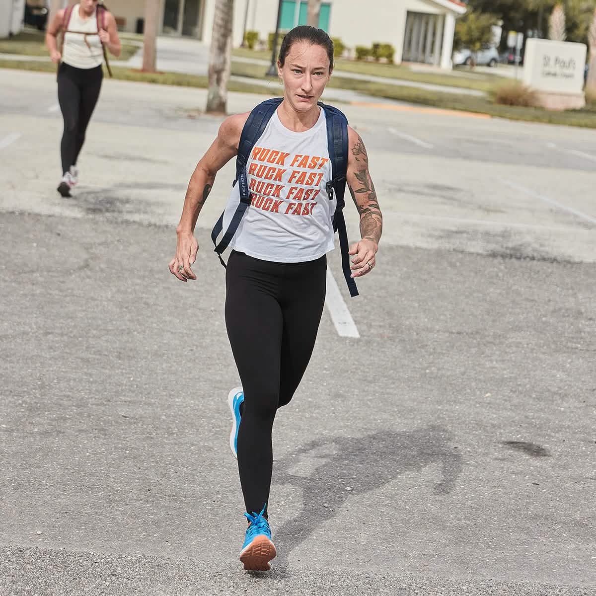 A Women's Rough Runner from GORUCK sprints towards the camera in a parking lot, wearing black leggings and a white sleeveless shirt with text. Sporting Electric Blue athletic shoes and a backpack, they exude energy. Another person looms in the background, while buildings and trees create a gradient density in the distance.