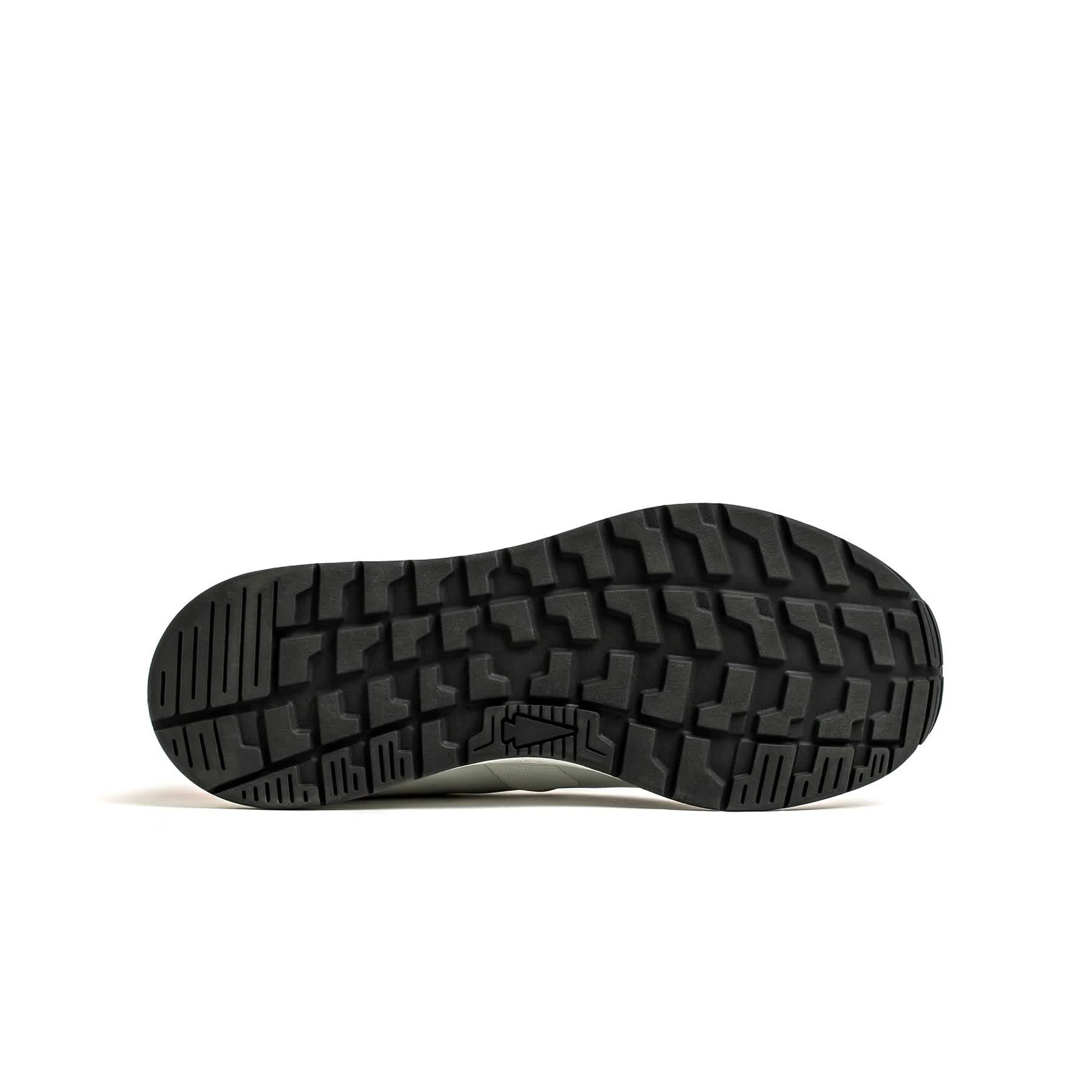 The image showcases the sole of a Women's Rough Runner - Light Grey + Red shoe by GORUCK, featuring a textured, rugged tread pattern. The black sole is crafted to enhance traction with an intricate array of geometric shapes forming a gripping surface against a white background, making it perfect for high mileage running shoes that prioritize durability and performance.