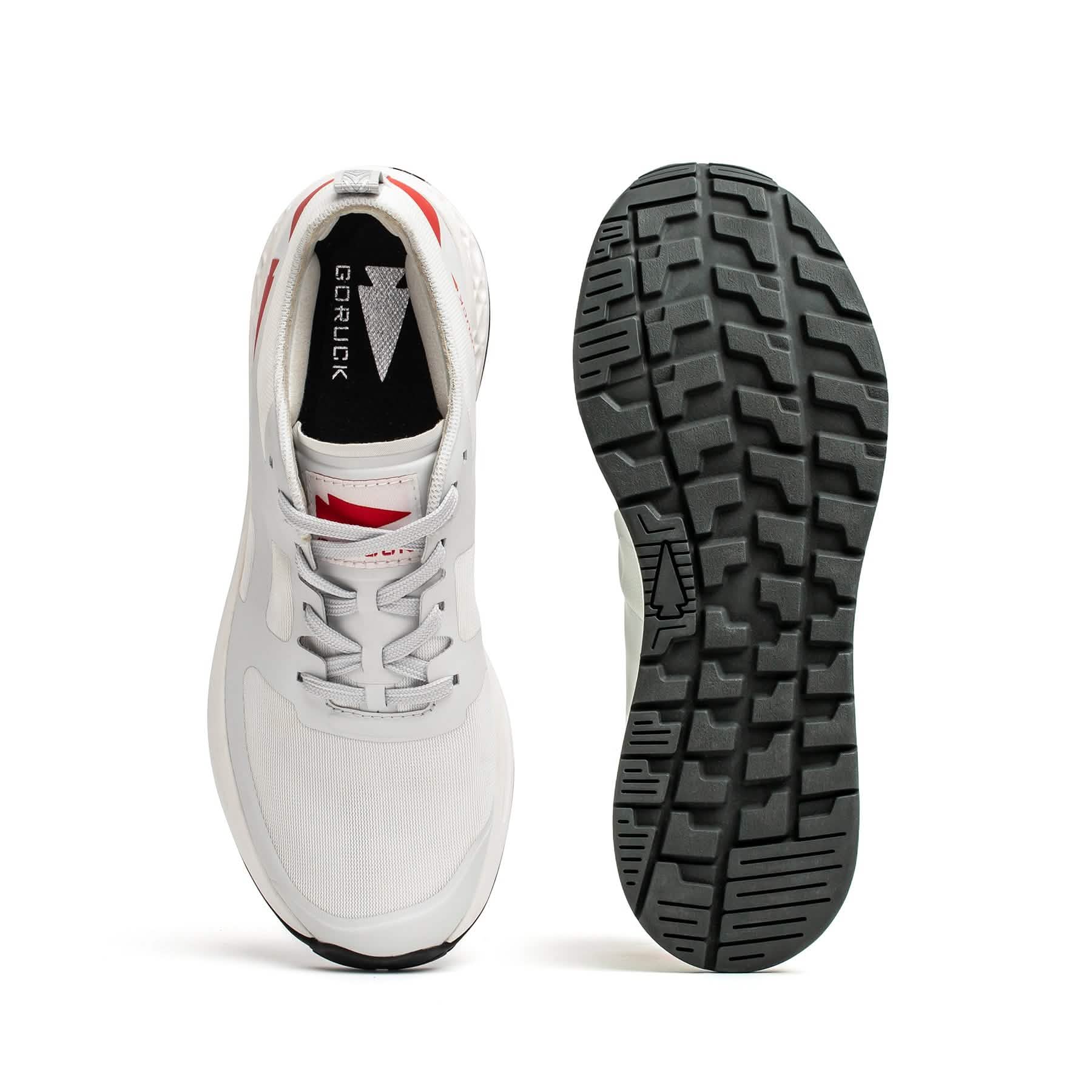 A pair of Women's Rough Runner shoes by GORUCK in light grey with red accents. One shoe is depicted from above, showcasing the laces and brand logo, while the other displays its textured black sole and Gradient Density EVA Midsole for enhanced comfort on tough running routes.