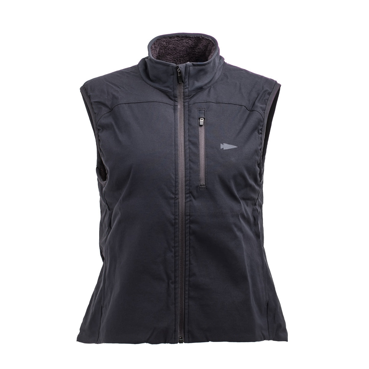 The Women's Vest of Power in ToughDry® + Fleece is a black sleeveless jacket with a high collar, front zipper, and small chest pocket. Inspired by GORUCK, this USA-built piece combines durability and style, making it an essential addition to your wardrobe.